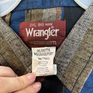 This NWT Vintage Flannel Wrangler Western Wear Pearl Snap Shirt in size 2XL Big features a classic collared neckline with a snap closure, perfect for casual, workwear, or even a party or travel occasion. Made of cozy flannel fabric with a retro Western theme, this shirt is machine washable and has a stylish blue striped pattern. The long sleeves, button accents, and chest pockets add to its functionality and appeal, making it a versatile addition to any man's wardrobe.