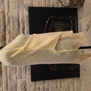 Pale yellow lightweight loose fit sweater with side slits, ribbed trim and raw hem. Perfect for fall or spring and very versatile! Wear with shorts, skirt, jeans or leggings. Layer over a cami, tube top or bralette.