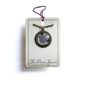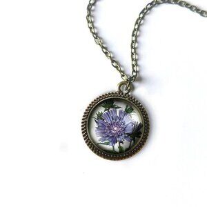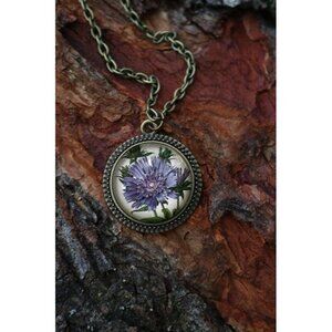This rare & retired handmade pendant necklace has a vintage-inspired image of a purple Aster Flower with an antiqued-bronze finish. The image is reversed decoupage under a 20mm glass cabochon, which is about the size of a quarter. This necklace can be worn throughout the year.