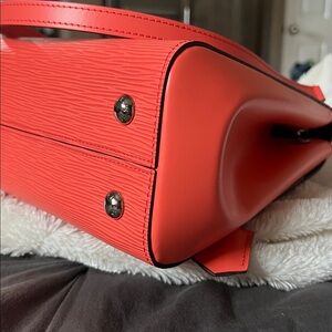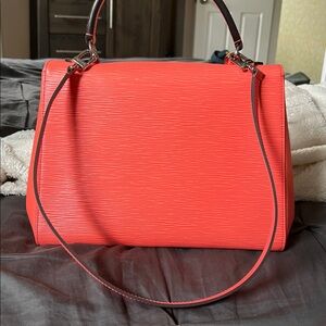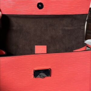 This is a BRAND NEW - never used - authentic LOUIS VUITTON Epi Cluny MM in Poppy. This is a stylish and distinctive medium-sized shoulder bag that is crafted of Louis Vuitton textured epi leather in bright red/orange. The bag features a looping leather top handle with silver links, an optional leather shoulder strap, smooth leather sides, a clochette, and a cross-over flap. This opens to a brown microfiber interior with patch pockets and a full-length zipper.