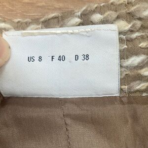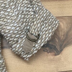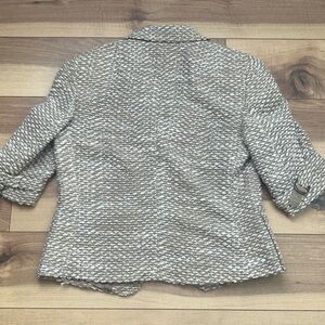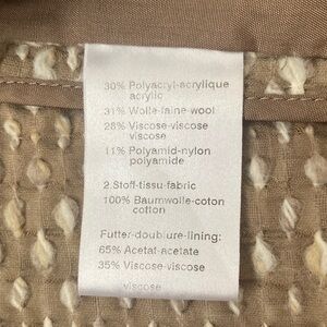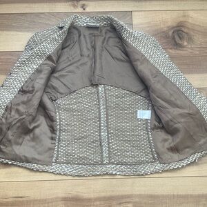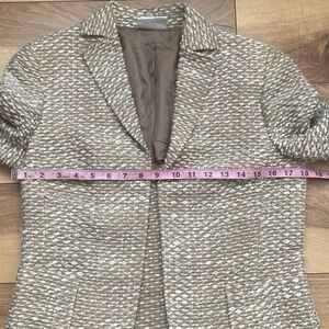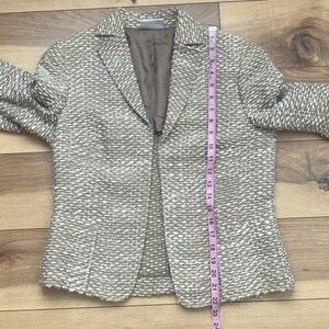 Akris Punto open front tan textured half sleeve blazer. Size 8. Front pockets. VGUC. Acrylic wool viscose polyamide blend. Measurements in pics. Dry clean recommended