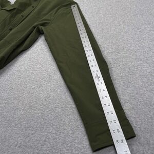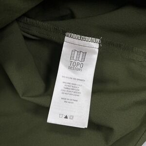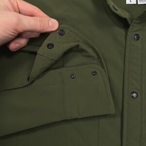 Men's Topo Designs Tech Shirt Snap Closure Army Green Solid Long Sleeve Zip Pocket Outdoor Gorpcore Techwear Casual Stretch Fishing Hiking Utility Shirt. 90% Nylon, 10% Spandex.