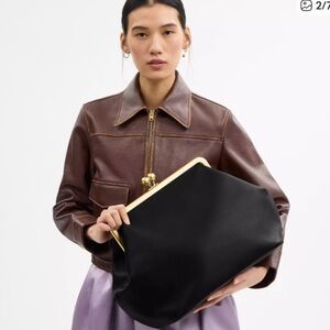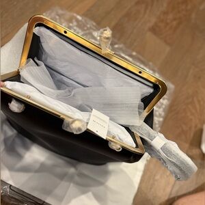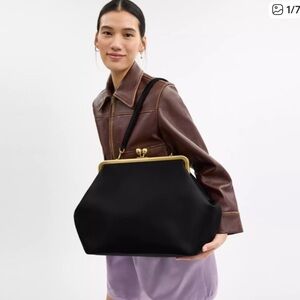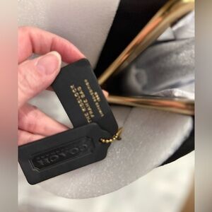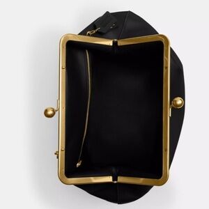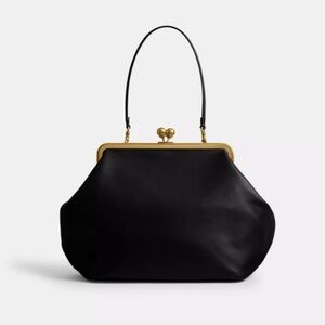 Chic Coach shoulder bag with a kisslock frame. Smooth black exterior and sleek silhouette. Shiny gold-tone frame and decorative kisslock closure. Single slim shoulder strap for easy carry. Classic, dress-ready design.