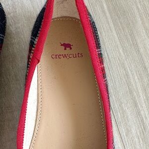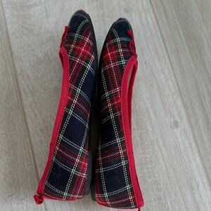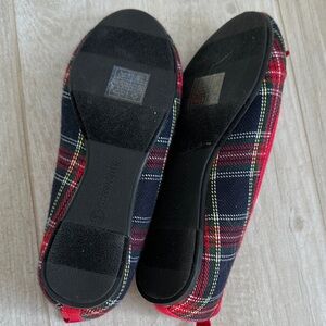 These J.Crew Crewcuts girls' ballet flats feature a festive tartan plaid pattern with red accents and a small bow detail.