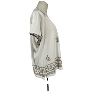Keywords: Pure Jill, embroidered, v-neck tee, floral print, white, petite, cotton, casual, relaxed fit, boho, daywear, lightweight, feminine, button accent