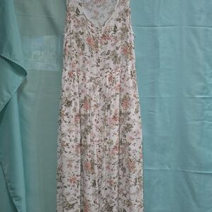 The product is a Frye women's maxi dress in a floral pattern, perfect for the summer season. The dress features a button front and is fully lined for added comfort and coverage. The multicolored flowers add a touch of style and charm, making it a great choice for any woman looking for a long, flowery dress for the warmer weather.
