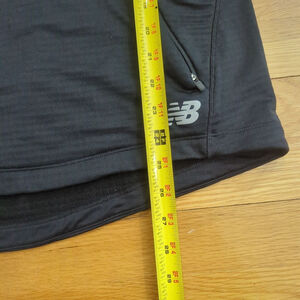 New Balance NB Heat Hoodie in black, size L, new with tags. The long-sleeved hoodie features a smooth exterior and waffle fleece onterior. There is a front kangaroo pocket with zippers on both sides, and thumbholes with reflective accents on the fold down cuffs. The back displays "NEW BALANCE RUNNING" text, and the lower left front has a New Balance logo. Measurements indicate a chest width of approximately 19.5 inches and a length of about 25 inches.