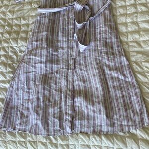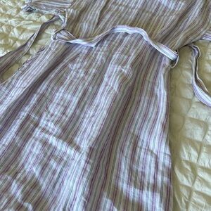 Elegant linen dress with multicolor stripes. Features a button-up front and a stylish belt. Ideal for casual wear.