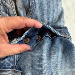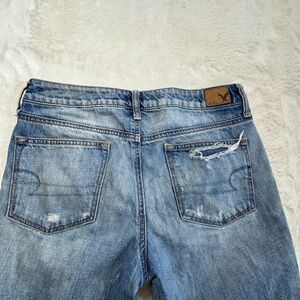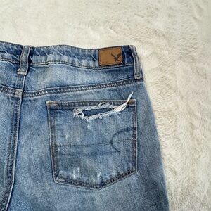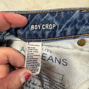 These American Eagle Boy Crop jeans feature a relaxed fit with a cropped leg and distressed detailing for a casual grunge-inspired look. The button fly and classic denim wash make them an easy everyday pair to style with sneakers, boots, or sandals.