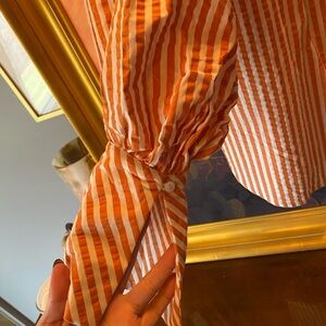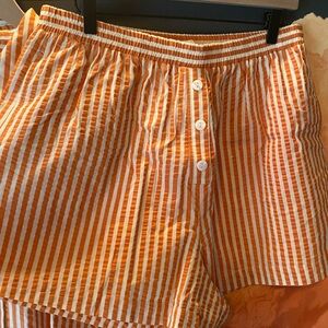 Lightweight orange and white striped with balloon sleeves and elongated cuffs. Soft, breathable fabric ideal for casual or smart-casual looks. Shorts are boxer style with elasticated waist