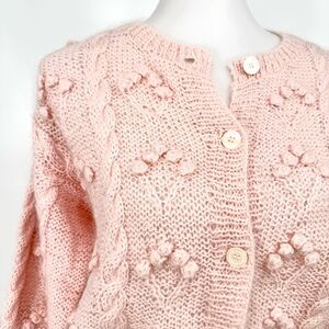 LIZ CLAIBORNE, Vintage, Mohair, Cardigan, Hand Knit, Popcorn, Bobble, Cable, Pink, Sweater, Medium, 80s, 90s, Fuzzy, Coquette, Grandmillennial, Cottagecore, Romantic, Pastel.