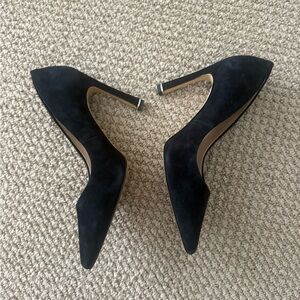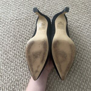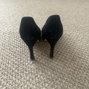 Elegant White House Black Market pointed-toe pumps in black suede. Smooth leather lining and cushioned footbed for added comfort. Versatile classic style for office or evening wear.