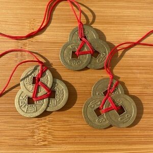 Three coins are strung together on a red string is a symbolism of a magnet for wealth as they represent the trinity of luck heaven earth and Man Kind The coins are strong with a red ribbon to empower the energy.
