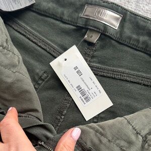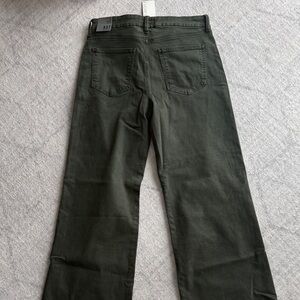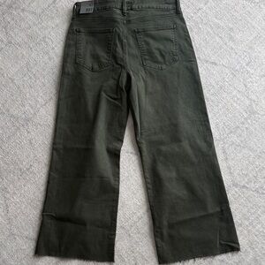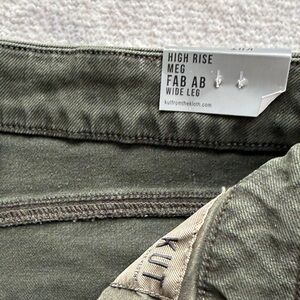 These high rise wide leg jeans feature Fab Ab pockets for a flattering fit. Made with super stretchy fabric and finished with a trendy raw hem, they combine comfort and modern style effortlessly. Sherwood green/olive color. 26.5 inseam