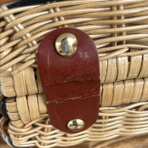 This unique piece is a vintage woven wicker and leather handbag, a classic style from the mid-20th century. These bags are often attributed to the 1950s or 1960s and were frequently manufactured in Hong Kong. Features a Multi-toned (brown, tan, and white) woven wicker or rattan body with genuine leather handles and accents. Distinctive brass-tone twist-turn lock or "barrel turn-lock" clasp on a leather flap. Often categorized under cottagecore, tiki culture, or rockabilly aesthetics. Perfect for any occasion. Measurements and all sides shown in photos. In excellent condition … only the bottom leather pieces show wear and tear (see photo closeup). Smoke-free home.