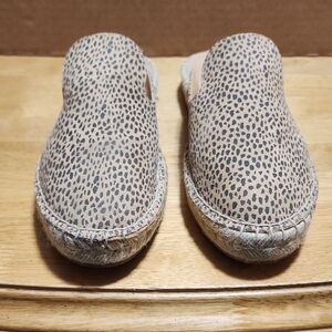 Slip-on espadrille mule with leopard-print upper. Jute-wrapped sole for casual flair. Soft footbed for easy wear. Neutral tones pair with many outfits.