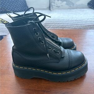 Dr. Martens Black Leather Platform Combat Boots with Yellow Stitching