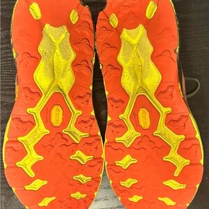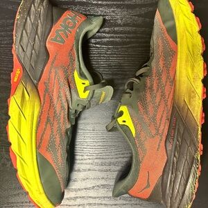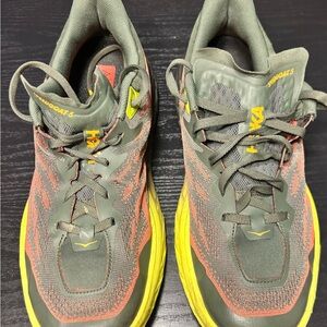 Hoka trail running shoes with olive mesh and neon yellow accents. Designed for performance and comfort.
