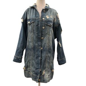 Oversized distressed denim shacket in a faded vintage blue wash with a relaxed drop-shoulder silhouette. The longer tunic length makes it perfect for layering over mini skirts, leggings, slip dresses, or festival outfits.