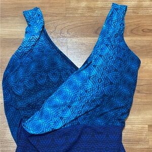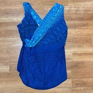 Sleeveless one-piece swimsuit with a wrap-front design. Ombre blue pattern transitions from bright turquoise to deep navy. Subtle all-over geometric print. Smooth, flattering silhouette.