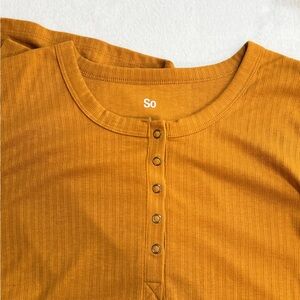 Cozy and cute SO brand long sleeve ribbed Henley top in a rich mustard/golden yellow. Features a partial snap-button placket, a high-low hem, and a relaxed fit — perfect for layering or wearing solo.
