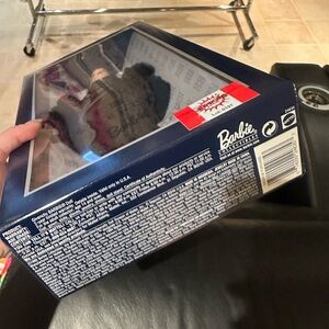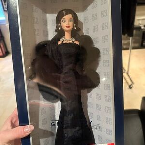 Collector Barbie dressed in a black evening gown with matching black fur stole. Features pearl-style necklace and earrings. Elegant, display-ready piece. Brand visible on backing: Givenchy Barbie.