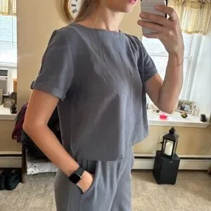 Stylish two-piece jumpsuit set in a versatile gray. Lightweight fabric with a relaxed, cropped top and wide-leg pants for comfortable all-day wear. Clean, minimalist design that pairs easily with sandals or heels.
