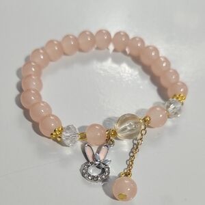 Elegant pink beaded bracelet with gold-tone accents and a sparkling bunny charm. Soft pink beads paired with clear faceted and gold beads create a feminine, polished look. Perfect for everyday wear or as a thoughtful gift.