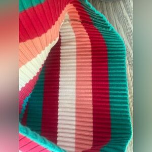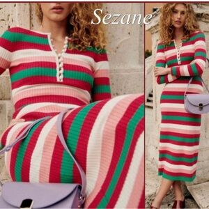 Sézane striped rib knit midi dress. Bold horizontal stripes in pink, red and green. Buttoned V-neck detail. Slim, figure-skimming silhouette. Vibrant, playful color palette.
