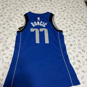 The product is a new Nike Luka Doncic Dallas Mavericks icon edition swingman jersey in women’s size Medium. This officially licensed basketball jersey features the player's name and number, as well as the Dallas Mavericks team logo. Made by Nike and designed for Ladies, this jersey is perfect for fans of the National Basketball Association looking to show their support for the team and player. The blue color adds a stylish touch to the overall look of the jersey, making it a must-have for any basketball enthusiast.