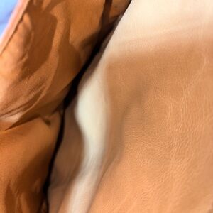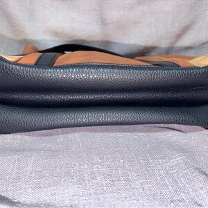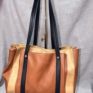 Relic leather tote in warm brown and cream panels. Long black shoulder straps for easy carry. Front slip pockets for quick access. Structured pebbled leather body with subtle detailing. Versatile, everyday style.