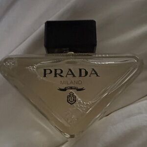 Prada Paradoxe Virtual Flower boxed perfume. Soft pink presentation with bold black logo. Refillable spray noted on front. Elegant, feminine packaging for gifting.