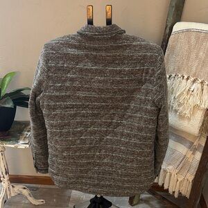 Grayers lightweight jacket with charcoal and taupe stripes. Features button closure and classic collar. Perfect for layering.