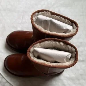 Soft leather exterior with cozy shearling lining. Classic mid-calf boot silhouette. Rich brown color with stitched detailing. Versatile and timeless style.