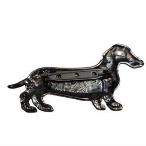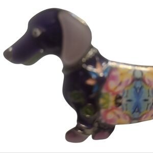 Whimsical dachshund brooch! Pewter metal base with a floral enamel coating in black, purple, pink, blue. Brooch measures 3" long x 1 1/2" tall. Straight back pin that snaps down on the clasp. New without tags.