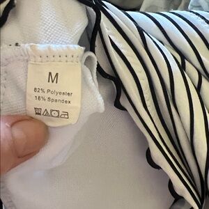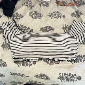 Flattering off-shoulder crop top with delicate black stripes. Lightweight, stretchy fabric provides comfortable all-day wear. Ruffled sleeve and hem details add a feminine touch. Perfect for casual outings or pairing with high-waist bottoms. Available in white with black stripes.