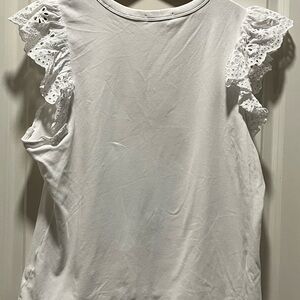 Beautiful white Free Assembly top featuring feminine eyelet ruffle sleeves that add a soft, romantic touch to a classic tee silhouette. This lightweight top is comfortable with a bit of stretch, making it perfect for casual outfits, summer wear, or layering.