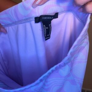 Forever 21 mini skirt in a soft lavender swirl print. Stretchy, lightweight fabric hugs the hips. Small lace trim at the hem adds a delicate detail. Easy to pair with casual or dressy tops.