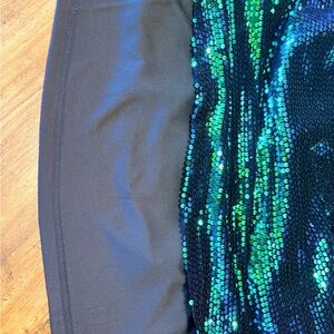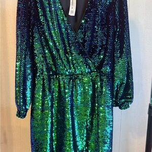 Sequin mini dress with shimmering green and blue tones. Wrap-style silhouette for a flattering fit. Long sleeves with elastic cuffs. Party-ready, eye-catching sparkle. Perfect Vegas trip dress! Has Liner for comfortable wear.