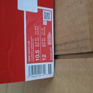 Close-up of a Nike Gato LV8 shoe box label. Crimson red panel with white text and sizing details. Clear brand and model labeling. These are brand new, never worn, Size 10.5, box is lidless.