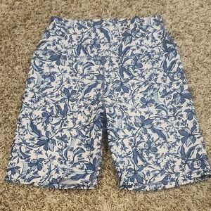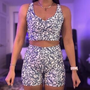 Blue floral print sports bra and bike shorts set on white background. Racerback design with supportive straps. Smooth, stretchy fabric for workout wear. Feminine botanical pattern for a polished look.