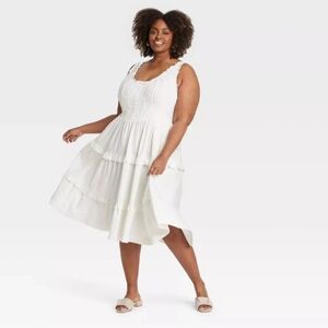 Look your absolute best during casual outings in this Corset Midi A-Line Dress from Ava & Viv. This sleeveless A-line dress features a scoop neckline, corset upper with front hook closure and smocked back for a flattering fit. Plus, the ruffle detailing on the tiered skirt adds beautiful movement to your look. Made from cotton-blend woven fabric for all-day comfortable wear, it's perfect for pairing with various footwear and accessories.