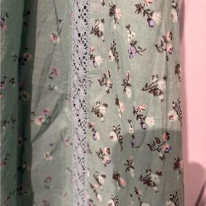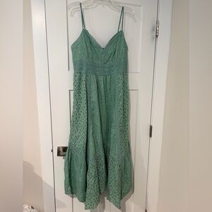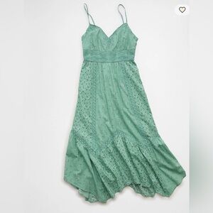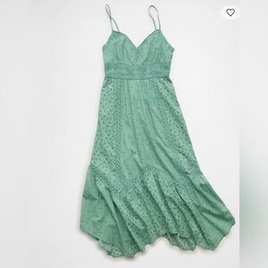 AMERICAN EAGLE MISSES V NECK LACE INSET HANKY HEM MIDI DRESS. Size Large. Green with a floral print. Lightweight woven Cotton in a sleeveless spaghetti strap style. V neckline with lace inserts and asymmetrical hanky hem. Made of 100% Cotton. Measures 53” adjustable shoulders to hem and 19” armpit to armpit. (The back has an elastic insert for the perfect fit. NWT! FIRM PRICE!