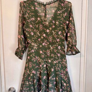 Keywords: Hello Molly dress, green floral dress, chiffon mini dress, lace trim dress, fit and flare dress, romantic dress, spring dress, date night dress