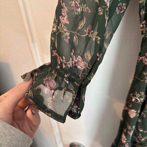 Hello Molly green floral mini dress with delicate lace trim neckline and sheer long sleeves. Features a flattering fit & flare silhouette, soft chiffon fabric, and back zipper closure. Feminine and flowy, perfect for date nights, brunch, weddings, or spring and summer events.