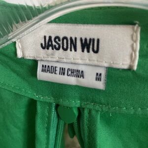 Description: Jason Wu ruffled mini dress, is so feminine and chic, made from cotton and spandex poplin in a stunning 'Virdian" shade, the Jason Wu dress has a deep V-neckline that is framed by voluminous puffed sleeves and cutout dealing. A pleated cut-and-sew skirt balances the shape. Two Zippers 1 on skirt, 1 on upper back.