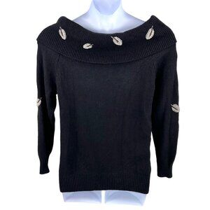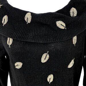Beautiful vintage sweater from E.M.T.! Black large collar, can be worn on or off shoulder, features pretty silver and black beaded leaves, long sleeves, size medium. 73% silk, 14% nylon, 11% angora rabbit hair, 2% lambswool. Great condition!