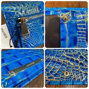 Brahmin Electric Indigo is a vibrant blue, croc-embossed leather finish featuring a saturated ombre effect with subtle shimmery gold undertones. This collection has a bold, modern, and luxurious look suitable for making a statement.