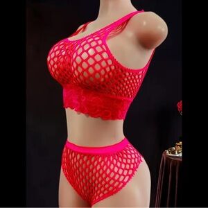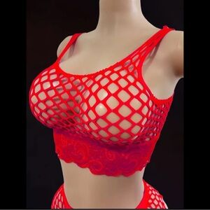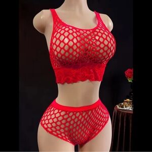 Red, Fishnet, Lingerie Set
