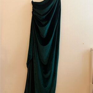 This is a stunning green emerald velvet one shoulder gown with a slit on the side really flattering rushing up the waist, only worn a handful of times in great condition.